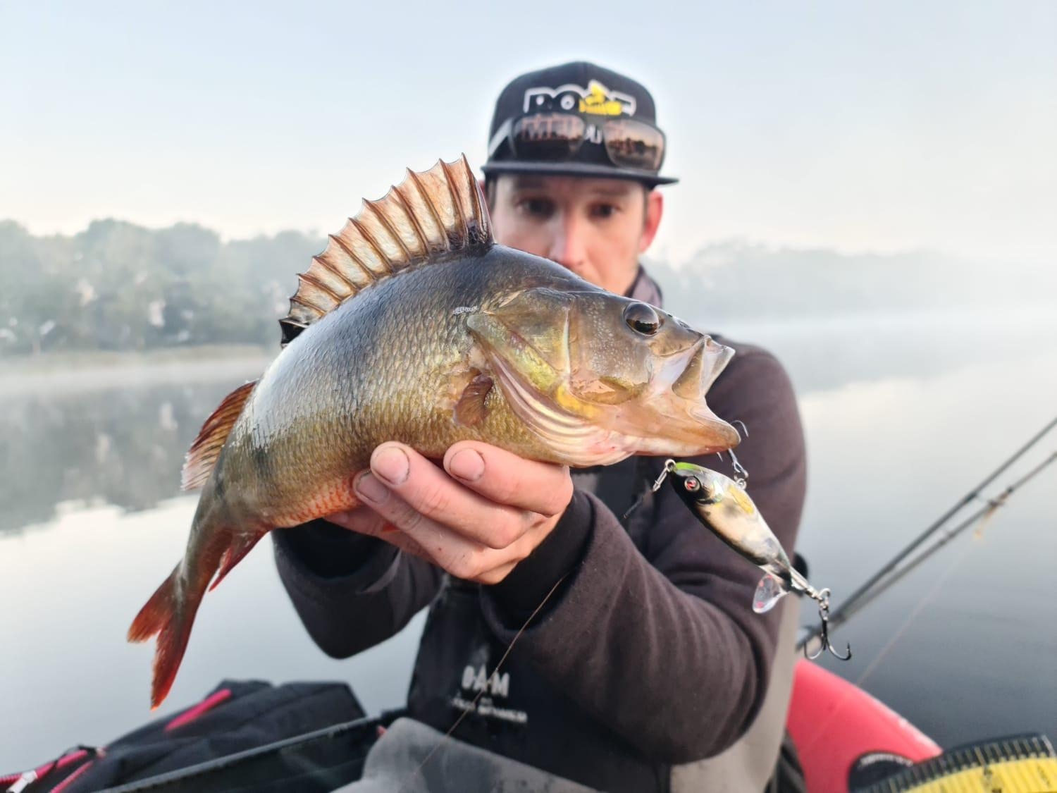 De tweede sessie was op een andere zandafgraving met een hele andere samenstelling. Dit is een veel natuurlijker meer met een aantal ondiepe plateaus met flinke plantenbedden. Plantenbedden die tot ver in het oppervlak doorlopen, maar in het najaar afsterven en daarna weer met te bevissen zijn. Hier is het al snel een paar keer raak. Enkele mooie baarzen worden gehaakt en ook geland. Op een of andere manier zijn ze hier wel trefzeker. Één keer bijten en gelijk hangen! Waar het aan ligt? Waarschijnlijk heeft de vis op open water meer tijd om te spelen en de prooi in te schatten en is het bij de vis die tussen de planten liggen een kwestie van pakken of laten gaan.